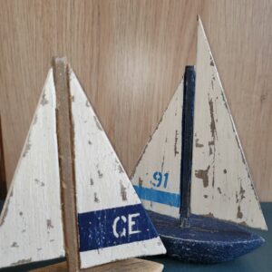 En résumé, ce petit voilier décoratif Batela en bois naturel avec ses voiles à rayures bleu marine est l'accessoire idéal pour une décoration bord de mer ou nature, invitant à la rêverie. Son aspect vieilli et sa petite taille en font un objet unique et facile à intégrer dans votre