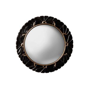 Ce miroir de sorcière Mitad transcende sa fonction première pour devenir un joyau mural où la puissance du noir brillant et la finesse d'un liseré doré subliment un cadre sculptural en forme de pétales. Véritable gardien de votre intérieur, il capture l'espace et la lumière dans ses 21 cm de