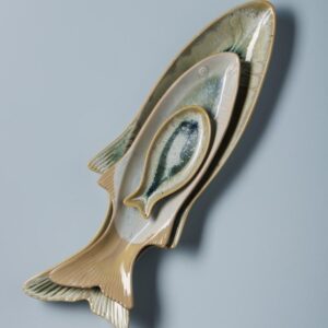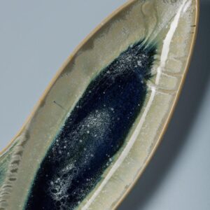 Ce mini plat poisson Nuance de Chehoma, en céramique, mesure 15,5x7 cm avec un rebord de 2 cm. Ses couleurs varient du gris au bleu profond, avec des paillettes argentées. Idéal pour présenter condiments, sauces et amuse-bouche, ou comme porte-savon dans une salle de bain, il s'accorde parfaitement avec le