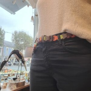 Cette ceinture cuir multicolore (marron,, bordeaux, orange et vert) à maillons de Cuir à Part, fabriquée artisanalement en France à partir de cuirs de taurillon et de buffle de qualité, est une pièce unique et ajustable qui apportera une touche d'originalité et de couleur à toutes vos tenues. Son design