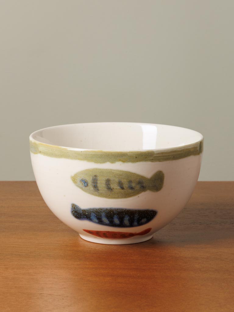 Le fond blanc du bol met en valeur la palette de couleurs vives des poissons. Un fin liseré vert d’eau vient subtilement encadrer le haut du bol, ajoutant une touche de douceur et d’équilibre à l’ensemble. Ce contraste harmonieux crée une composition visuelle pleine de personnalité, qui reflète un véritable savoir-faire artisanal. On perçoit dans les lignes du liseré et des motifs le charme d’une pièce façonnée avec soin et attention.