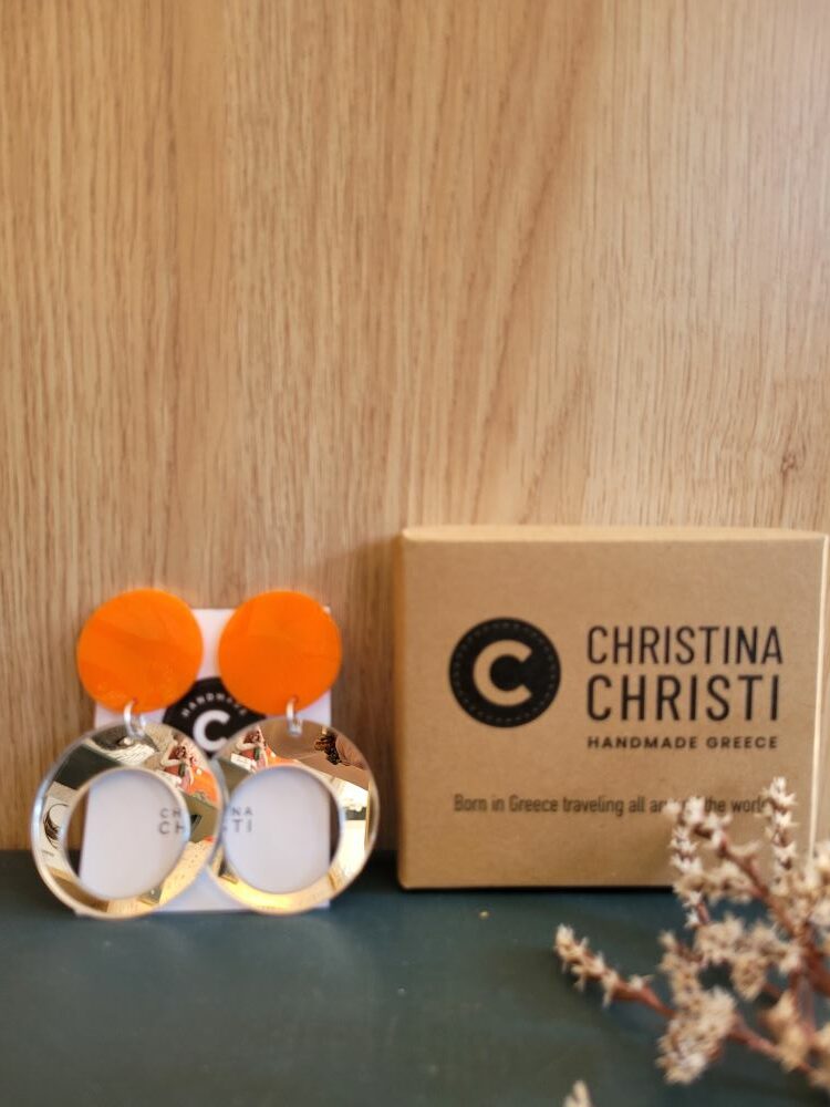 L’orange, couleur phare des Seventies, symbolise la créativité et la liberté. Christina Christi l’utilise ici pour une pastille de 3,5 cm de diamètre qui s’ancre parfaitement au lobe. Ce point de couleur intense est ensuite prolongé par le pendentif rond effet miroir, ajoutant une dimension glamour et réfléchissante. En portant ces clips, vous affichez un look qui respire le soleil méditerranéen et le chic rétro, tout en bénéficiant de la qualité et du savoir-faire artisanal grec de la créatrice.