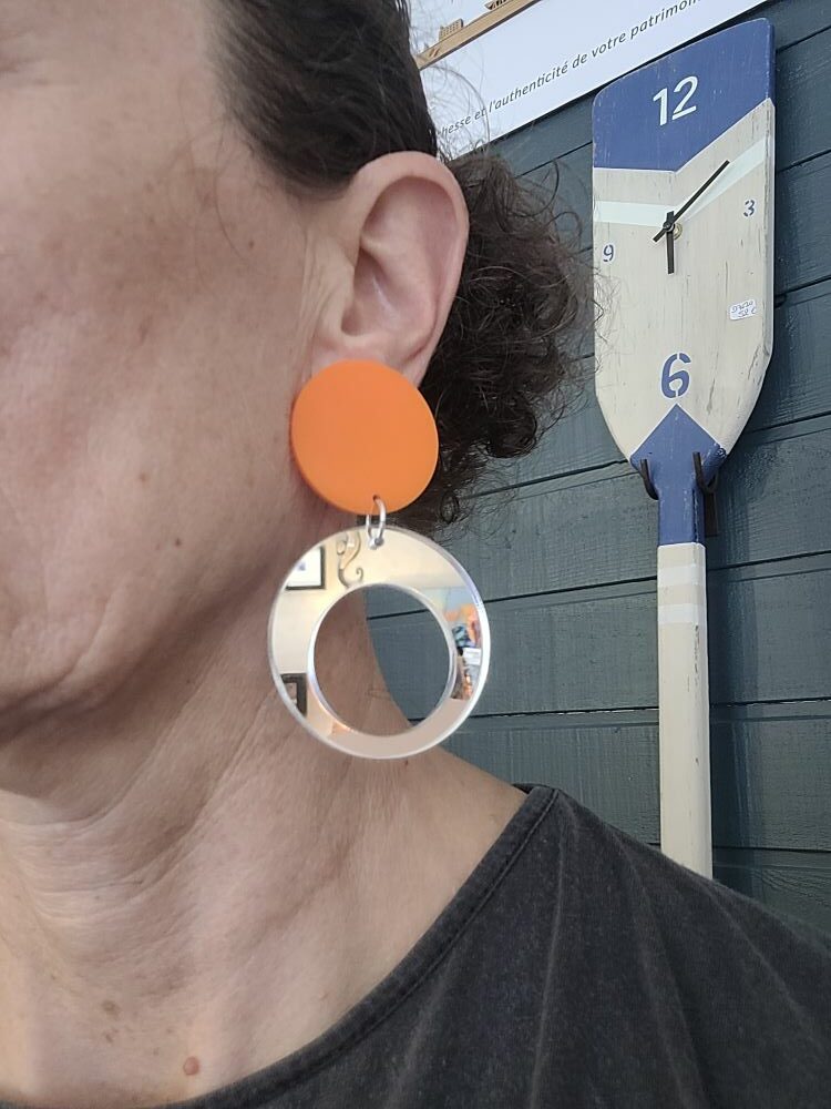 Ces audacieuses boucles d’oreilles clips miroir orange, conçues par Christina Christi, marient le dynamisme pop des années 70 à la légèreté du plexiglas (9g), offrant une hauteur de 8 cm pour un look graphique et incroyablement glamour, parfait pour toutes les oreilles.