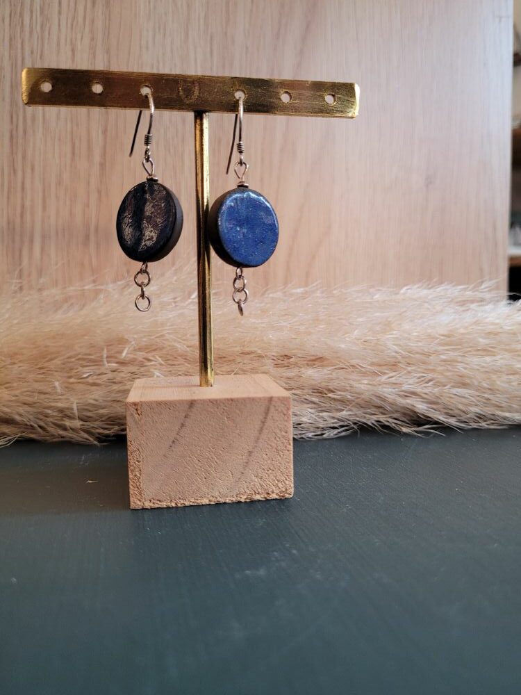 Le design de ces boucles d’oreilles est remarquablement contemporain. Elles se composent d’un disque de faïence noire, une forme épurée qui assure une présence visuelle sans être ostentatoire. La surface de ce disque est recouverte d’un émail bleu dont la couleur peut varier de l’indigo profond au bleu cobalt lumineux, capturant la lumière de manière spectaculaire. Cet émail vibrant contraste de façon saisissante avec le noir mat de la faïence visible sur les tranches ou le dos, créant un effet de profondeur et de mystère.