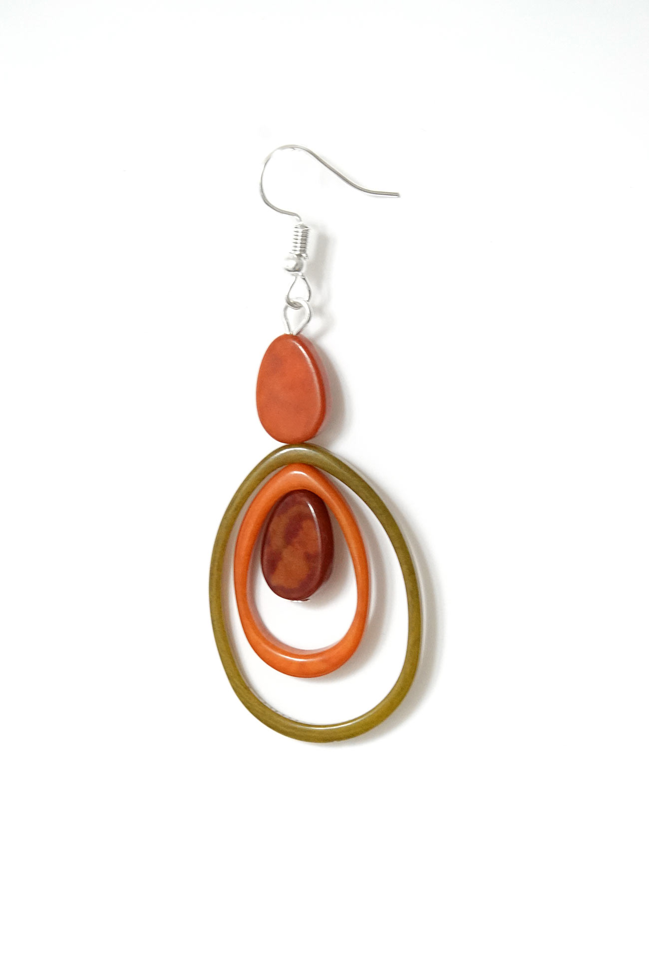 Cette superposition de formes ovales crée un effet de profondeur et de mouvement. À chaque inclinaison de la tête, les anneaux captent la lumière, révélant la richesse des pigments naturels utilisés par Tagua & Co.