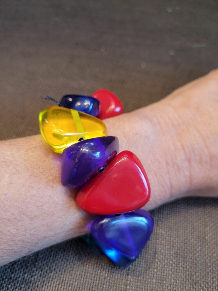 Cette transparence permet à la lumière de traverser et de se réfracter à travers les perles, créant un jeu d’ombre et de lumière kaléidoscopique. Les couleurs sont injectées dans la masse, assurant une saturation et une durabilité maximales. Le mélange de teintes vives – du rouge rubis au vert émeraude, du bleu saphir au jaune soleil – fait de ce bracelet une véritable explosion chromatique au poignet. L’effet est celui de pierres précieuses mélangées, à la fois luxueux et ludique.