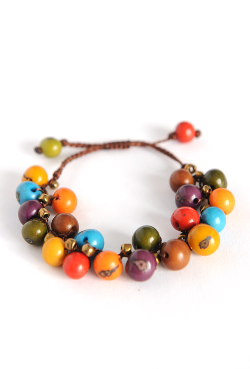 À cela s’ajoutent les graines d’açaï multicolores, véritables joyaux de la forêt amazonienne. Récoltées de manière durable, ces petites graines sont teintes selon des procédés traditionnels pour obtenir une palette de couleurs vives et chatoyantes qui apportent une énergie joyeuse au bracelet. Les perles dorées, discrètement insérées entre les graines et la tagua, ajoutent une touche d’élégance et de lumière, créant un contraste subtil qui met en valeur les teintes naturelles et vives des autres éléments. Cette combinaison de matériaux crée un équilibre parfait entre l’authenticité brute de la nature et la sophistication artisanale.