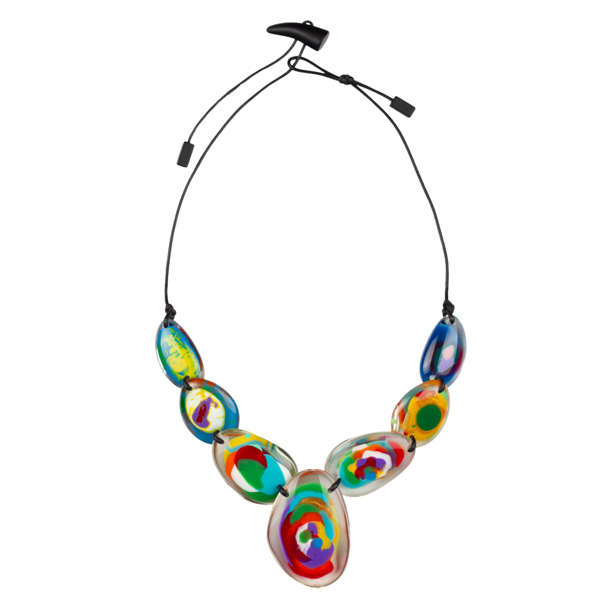 Look Décontracté Chic : Portez-le sur un chemisier blanc impeccable légèrement ouvert, associé à un jean brut. Le collier devient alors la pièce centrale qui rehausse instantanément une tenue simple, lui apportant une dimension artistique et recherchée. Les couleurs de la résine ressortiront avec éclat sur le blanc neutre.