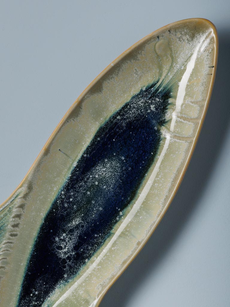 Le plat se distingue par ses couleurs captivantes, une variation du gris au bleu profond. Cette palette chromatique, riche et complexe, évoque les différentes teintes de l’océan, des vagues grises d’une mer agitée aux bleus intenses des abysses. Cette nuance subtile est ce qui confère à ce plat son caractère unique et son élégance intemporelle. Pour ajouter une touche de magie, la surface de la céramique est saupoudrée de paillettes argentées. Ces éclats délicats rappellent la lumière qui se reflète sur l’eau, les écailles chatoyantes d’un poisson ou le scintillement des étoiles sur la mer. Ce détail subtil mais raffiné transforme ce plat en un objet précieux, capable de capturer le regard et d’émerveiller vos invités.