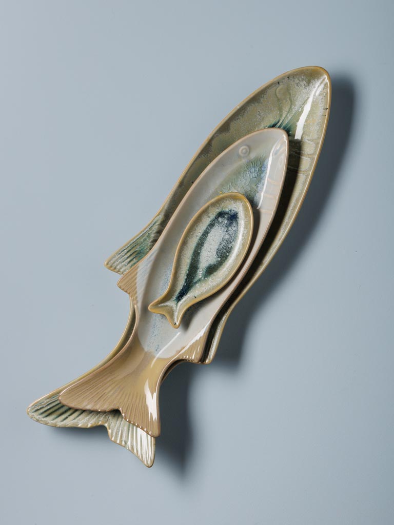 Mais ce plat n’est pas seulement un plat d’apéritif. Il est également idéal pour présenter un poisson entier grillé ou cuit en papillote. Sa taille permet d’accueillir un grand poisson, et sa forme unique en fait un plat de service hors du commun. Imaginez un bar ou une dorade servi sur ce plat magnifique, ses couleurs et ses reflets mettant en valeur la fraîcheur du poisson. C’est une invitation au voyage, aux repas de bord de mer et aux saveurs iodées.
