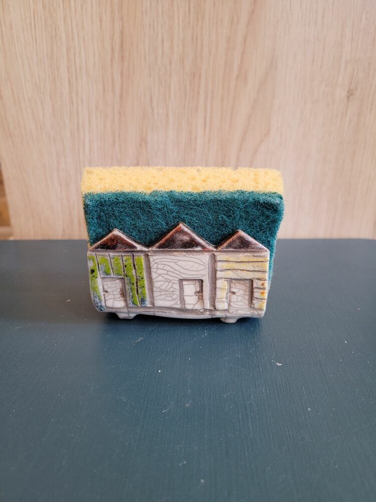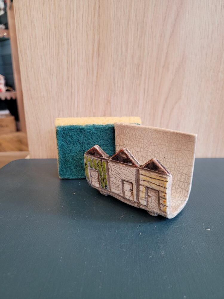 Ce porte-éponge se distingue par son motif figuratif représentant les cabanes ostréicoles ou de pêche, ces constructions modestes et colorées qui font partie intégrante du paysage vendéen. Les teintes choisies – un jaune lumineux rappelant le soleil de l’Atlantique et un vert nature évoquant la verdure des marais et l’eau des parcs à huîtres – sont appliquées avec soin sur la céramique. L’effet est à la fois frais, rustique et joyeux, conférant à l’objet une personnalité forte et chaleureuse.