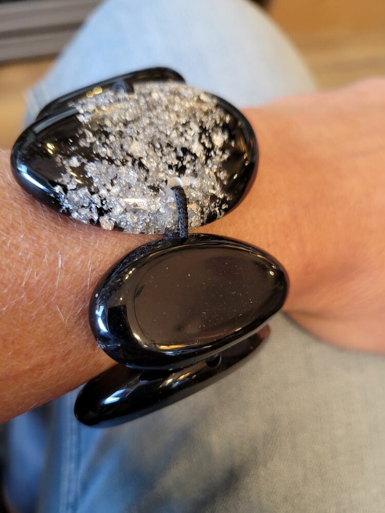 Le point culminant du raffinement de ce bracelet réside dans une perle spécifique : l’une des pièces maîtresse contient des paillettes argentées incrustées dans la résine noire. Cet ajout n’est pas une simple décoration, mais une source d’éclat subtil et sophistiqué.