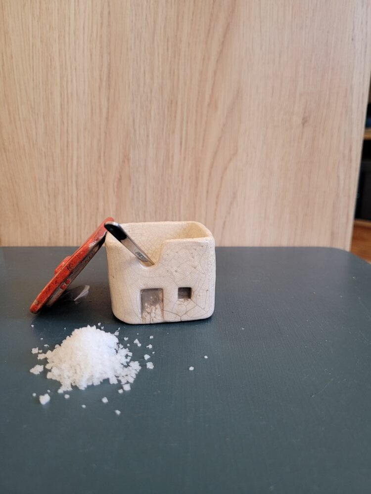 Le design de cette maison à sel s’inspire des petites cabanes que l’on trouve traditionnellement dans les paysages uniques des marais salants vendéens. Ces constructions modestes, souvent faites de bois et coiffées de toits rouges, font partie intégrante du patrimoine local et symbolisent le travail artisanal et la récolte précieuse du sel. En reproduisant cette forme familière et pleine de sens, la céramiste “Les Feux Follet” nous invite à un voyage sensoriel au cœur de ces paysages emblématiques. Cette maison à sel n’est pas seulement un objet utilitaire, c’est un fragment de mémoire et une ode à l’authenticité.