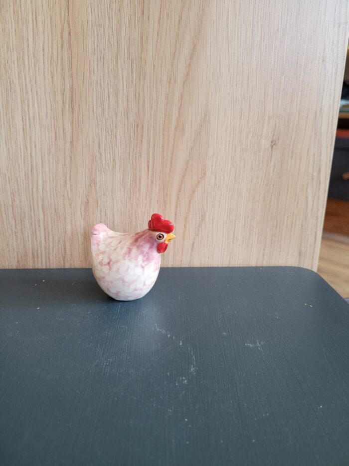 Cette mini poule rose illustre parfaitement cette approche artistique. Sa petite taille la rend particulièrement attachante, tandis que sa couleur rose douce lui apporte une tendresse et une délicatesse indéniables. Les détails subtils de sa forme, de son plumage finement suggéré à sa petite crête joliment modelée, révèlent le soin et l’attention que l’artiste porte à chaque détail, même dans une si petite échelle. C’est une invitation à apprécier la beauté dans les petites choses.
