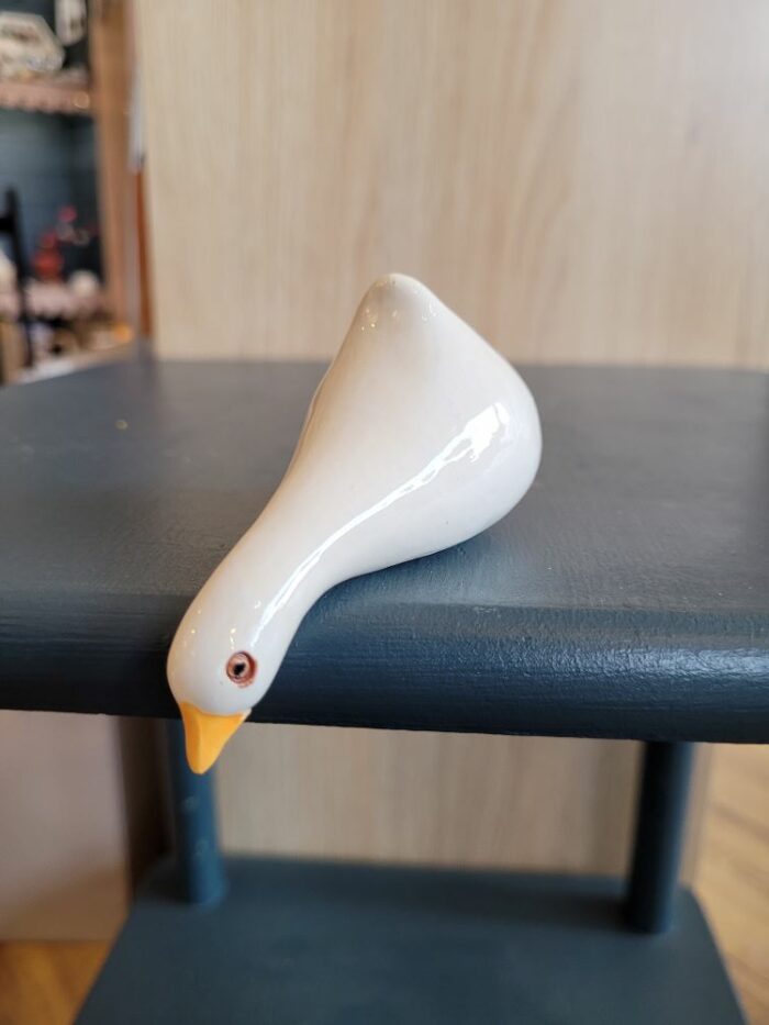 Conçue pour être posée avec grâce sur une étagère ou un meuble, cette oie décorative miniature est parfaite pour ajouter une touche de charme subtil à vos espaces. Sa posture penchée offre des possibilités de mise en scène délicates. Vous pouvez l’orienter de manière à ce qu’elle semble observer un petit objet précieux, une plante miniature disposée à proximité, ou même le bord d’un livre, créant ainsi un lien visuel discret et plein de poésie. Imaginez-la ajoutant une note de douceur à votre table de chevet, à votre bureau ou à une petite niche décorative.