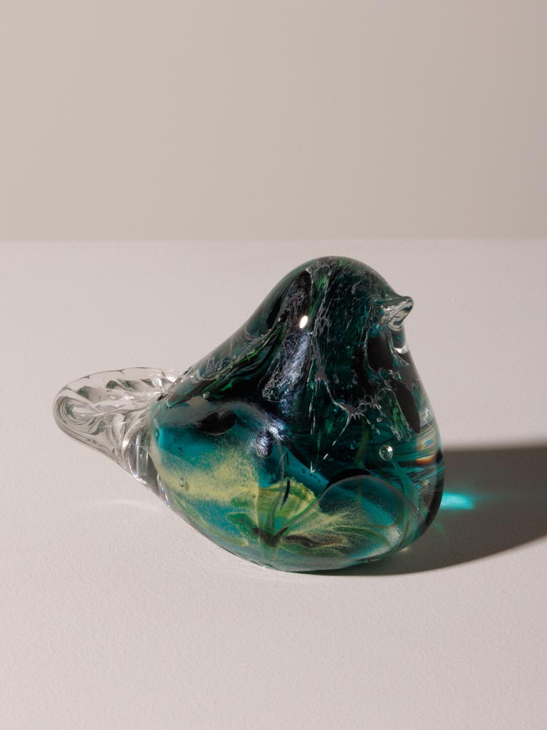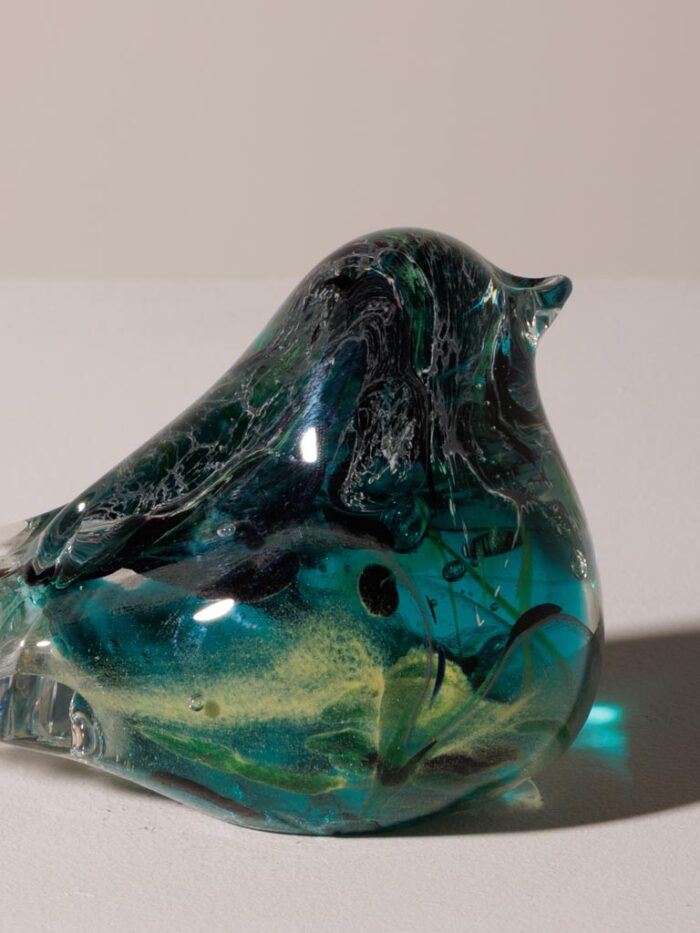 L’Oiselet de Verre “Ailes d’Azur” est le fruit d’un savoir-faire artisanal méticuleux. Chaque courbe, chaque détail de sa forme a été pensé pour évoquer le mouvement et la vitalité d’un oiseau. La transparence du verre permet à la lumière de jouer avec la couleur bleu-vert, créant un kaléidoscope de reflets qui évoluent au fil de la journée. Les traits noirs internes, finement travaillés, ajoutent une dimension artistique unique, soulignant la structure de l’oiseau et lui conférant une profondeur visuelle. Ces inclusions ne sont pas de simples décorations, elles donnent l’impression que l’oiseau est esquissé de l’intérieur, un véritable tableau en trois dimensions.