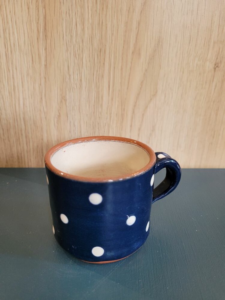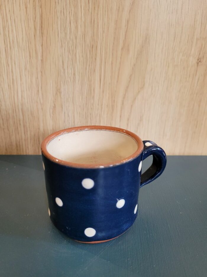 Tasse à café artisanale en céramique à pois blancs sur fond bleu marine – Poterie Frédérik Le Fur. Cette pièce unique, façonnée à la main dans le Tarn-et-Garonne selon les techniques traditionnelles des terres vernissées, arbore un charmant motif de pois blancs sur un élégant fond bleu marine et offre une grande praticité grâce à sa compatibilité lave-vaisselle et micro-ondes.