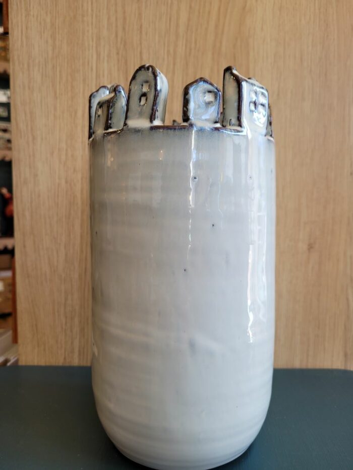 Le vase S Polignano s’inspire des maisons blanches perchées sur les falaises de Polignano a Mare, un village italien emblématique. Les petites maisons miniatures en relief, disposées en couronne sur le haut du vase, créent un paysage miniature fascinant. La forme cylindrique du vase, à la fois simple et élégante, met en valeur ce détail unique.