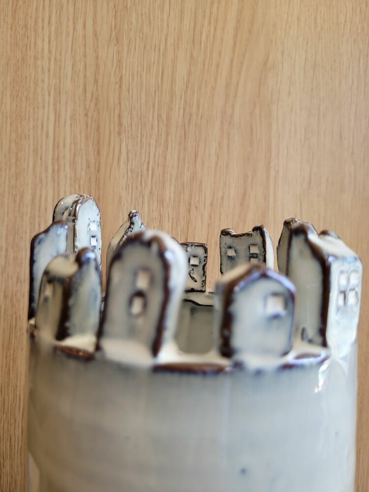 Les petites maisons miniatures en relief sont réalisées avec une grande précision, reproduisant les détails des toits, des fenêtres et des portes. Leur finition mate et leur couleur gris clair leur donnent un aspect minéral, comme si elles étaient sculptées dans la roche.